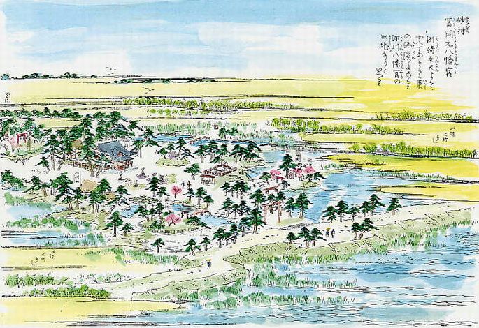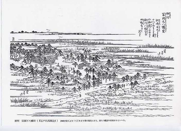 洲崎弁天より十八丁あまり東の海浜にあり。深川八幡宮の旧地なりといへり。
