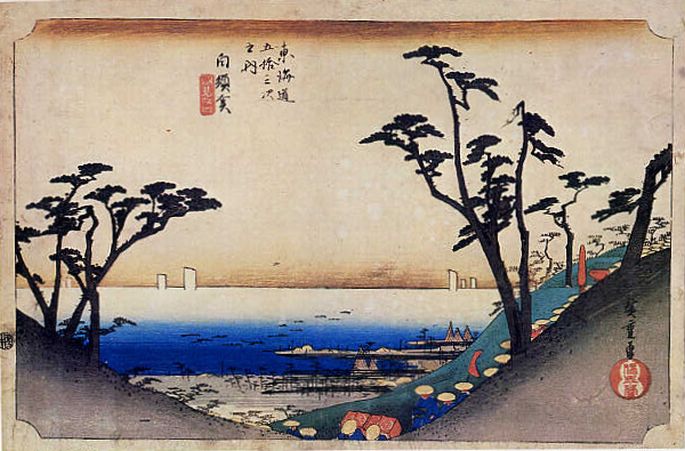 たまたま広重センセイが目にした情景なんだろう。三滝川かぜそそぐ那古浦の蜃気楼は知られている。