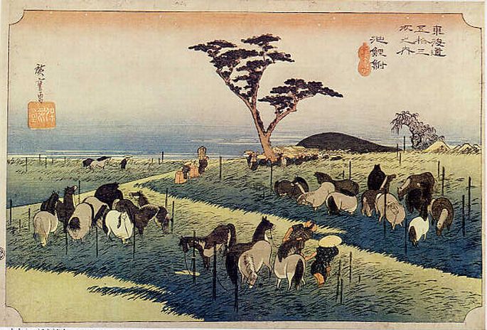 馬市は、宿場の東の野で毎年開かれ、4月25日にはじまって5月5日におわる。広重は、馬のいない野原を見て、 想像で馬をつないだのだろう。