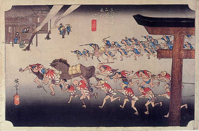 広重センセイが随行している、例年8月朔日に幕府が朝廷に献上馬の一行。「控えろひかえろ、御馬が通る」で土下座。