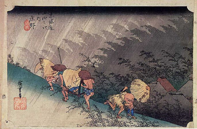 激しい雨に抗して、鍬を担いで坂道を下る農民、登坂を息を切らしながら急ぐ駕籠かき、