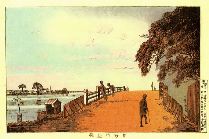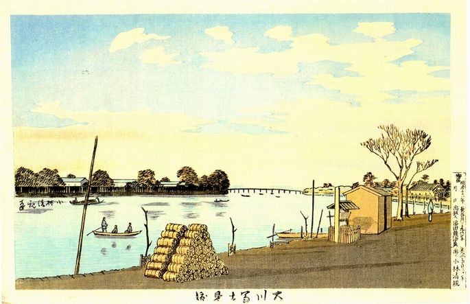 (大川ぞいにあった「一之橋は、人足寄場のあった石川島と月島を結ぶ橋だけである。 最初は両国の竪川に架かる一ッ目の橋と思ったが、切絵図を調べて、石川島としたが、対岸の広さからいっても、 一ッ目の橋のほうが正解かも知れない)。