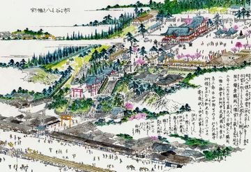 キャプション:或人の説に、市谷、昔は市の立ちし地なりゆゑに市買ひに作りたりといふ。しかれども詳らかならず。按ずるに、鎌倉鶴岡八幡宮に蔵するところの延文三年(1358)12月22日の(足利)基氏の古証文に、「鶴岡八幡の雑掌任阿(にんあ)申す。武蔵国金曾木彦三郎・市谷四郎等のこと、江戸淡路守押領を止む。正和元年(1312)8月11日の寄進状に任せ、社家に付きて沙汰せらるべし」と云々。証とすべし。社地に儀台(しばい)・楊弓(ようきゅう)の類ありて、つねに賑はし。また社前の大路は四谷への往来にて行人(こうじん)絡繹(らくえき)たり。