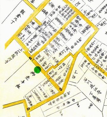 右手の緑○=入江町の鐘楼前の長谷川邸が小説で設定された、平蔵とは無縁の長谷川家。