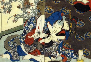 春慶寺の離れへ行き、左馬をたしかめたいが、お紺の時のように、お雪とのあられもない場面を目にするのは気にそまない。(国芳『葉奈伊嘉多』口絵 部分 お紺のイメージ)